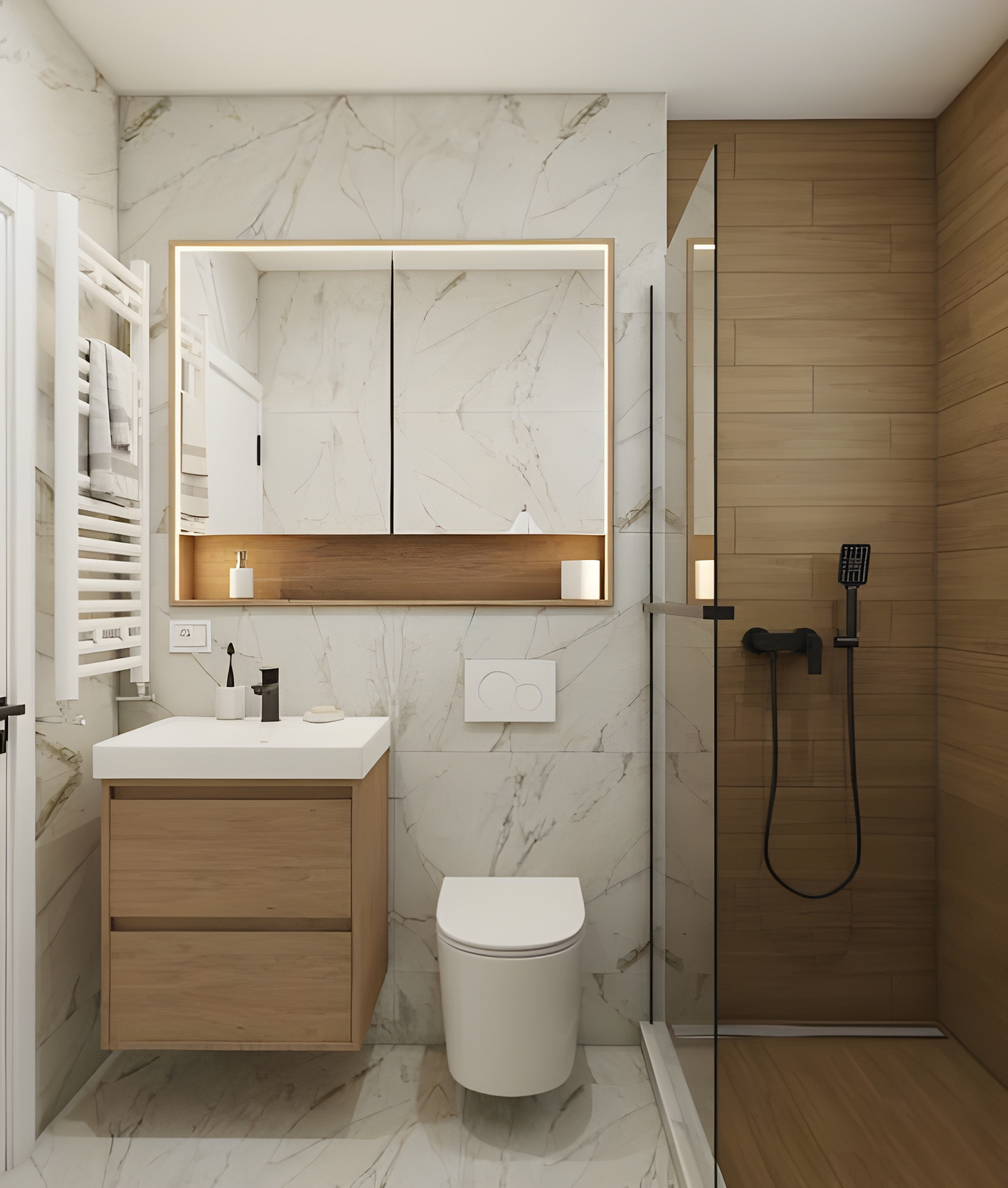 Instalación de muebles flotantes, lavamanos y espejos con iluminación LED.